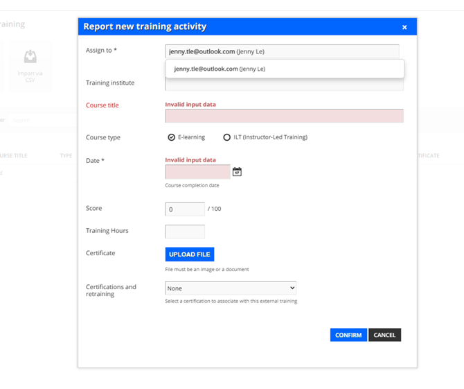 - In the pop-up, complete the mandatory fields: Assign to, Course title, Date
